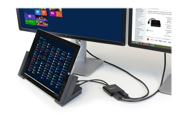 Med denna MST-hubb kan du ansluta två DisplayPort-skärmar till din Mini DisplayPort-dator. MST fungerar på alla Windows -enheter som stöder DisplayPort 1.2, som till exempel modeller av Lenovo Think Pad och Microsoft Surface . Vid anslutning till tidigare versioner av DisplayPort, som till exempel DP 1.1, fungerar MST-hubben som en videosplitter. MST-hubben är USB-driven så att det enda du behöver för att använda hubben är din dator.