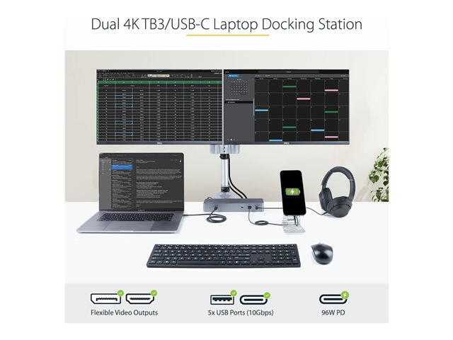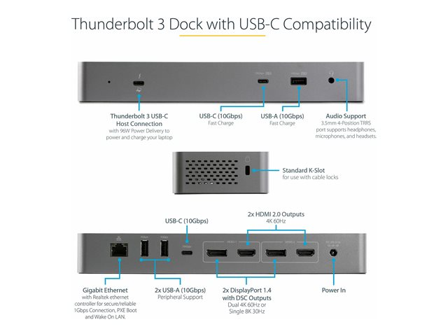 En högpresterande Thunderbolt™ 3-certifierad dockningsstation med USB Type-C®-kompatibilitet för dubbla skärmar 4K 60Hz DSC-stöd från antingen dubbla DisplayPort 1.4- eller dubbla HDMI 2.0-videoutgångar, 96 W strömförsörjning (100 W toppeffekt), 5 x USB 3.2-hubb med 2x BC 1.2 snabbladdningsportar, Gigabit Ethernet och headsetportar. Flexibla utgångar för dubbla skärmar Denna universella dockningsstation har både dubbla DisplayPort 1.4 (Single 8K30 på HBR3-värd) och dubbla HDMI-videoutgångar som kan konfigureras på tre olika sätt: DisplayPort + DisplayPort: HDMI + HDMI DisplayPort + HDMI Upplösningar och videoutgångar är värdberoende. Värdutgång DCS-status Enkel video Dubbel video Thunderbolt med DP 1.4 (nVidia Graphics) Av 8K (7680 x 4320) vid 30 Hz (endast DP) ej tillgängligt Thunderbolt med DP 1.4 (nVidia Graphics) Av ej tillgängligt 2x 4K (3840x2160) vid 60 Hz Thunderbolt med DP 1.4 (nVidia Graphics) På 4K (3840x2160) vid 144 Hz ej tillgängligt Thunderbolt med DP 1.4 (nVidia Graphics) På ej tillgängligt 2x 4K (3840x2160) vid 60 Hz Thunderbolt med DP 1.4 (Intel Graphics) ej tillgängligt 5K (5120x2880) vid 60 Hz (endast DP) ej tillgängligt Thunderbolt med DP 1.4 (Intel Graphics) ej tillgängligt ej tillgängligt 2x 4K (3840x2160) vid 60 Hz Thunderbolt med DP 1.2 ej tillgängligt 4K (3840x2160) vid 60 Hz ej tillgängligt Thunderbolt med DP 1.2 ej tillgängligt ej tillgängligt 2x 4K (3840x2160) vid 60 Hz USB Type-C DP Alternate Mode DP 1.4 Av 4K (3840x2160) vid 30 Hz ej tillgängligt USB Type-C DP Alternate Mode DP 1.4 Av ej tillgängligt 2x QHD (2560x1440) USB Type-C DP Alternate Mode DP 1.4 På 5K (5120x2880) vid 60 Hz (endast DP) ej tillgängligt USB Type-C DP Alternate Mode DP 1.4 På ej tillgängligt 2x 4K (3840x2160) vid 60 Hz USB Type-C DP Alternate Mode DP 1.2 ej tillgängligt 4K (3840x2160) vid 30 Hz ej tillgängligt USB Type-C DP Alternate Mode DP 1.2 ej tillgängligt ej tillgängligt 2x 1080p (1920x1080) vid 60 Hz Fler USB-portar nedströms Med sin integrerade USB 3.2-hubb har denna dockningsstation 5 USB-portar nedströms: Framsida: 1x USB 3.2 Gen 2 Type-C (10 Gbit/s) med 15 W (3 A, 5 V) laddning 1x USB 3.2 Gen 2 Type-A (10 Gbit/s) med B.C. 1.2 snabbladdning Baksida: 2x USB 3.2 Gen 1 Type-A (5 Gbit/s) 1x USB 3.2 Gen 2 Type-C (10 Gbit/s) Enkel att installera och hantera Denna universella Thunderbolt 3/USB-C-dockningsstation har en automatisk drivrutinsinstallation och inkluderar en 0,8 meter lång Thunderbolt 3-värdkabel, framåtriktad TB3/USB-C-värdport, framåtriktad LED-indikator, monteringshål för valfritt fäste, k-plats för säkerhetslås och MAC address changer-verktyg Transparens för anslutna enheter med StarTech.com MAC Address Changer Utility TB3CDK2DHUE innehåller en kostnadsfri Windows -applikation för bättre hantering av ditt företags nätverkssäkerhet. När du ansluter till ditt nätverk via Ethernet-porten på dockningsstationen, sänds datorns MAC-adress vanligtvis inte till nätverket, eftersom ditt nätverk bara ser dockningsstationens MAC-adress. StarTech.com MAC Address Changer eller kloningsprogramvaran gör det dock möjligt för USB-C-dockningsstationen att använda MAC-adressförfalskning av den anslutna bärbara Windows-datorn snarare än MAC-adressen för själva dockningen. Detta säkerställer att dina nätverksadministratörer har full insyn i varje enhet i nätverket och kan övervaka och begränsa aktiviteten i enlighet därmed. Om du vill begära åtkomst till vårt MAC Address Changer-verktyg, ska du kontakta vår tekniska supportavdelning per telefon, livechatt eller e-post. TB3CDK2DHUE täcks av StarTech.coms livstidsgaranti och gratis livstidsgaranti på teknisk support.